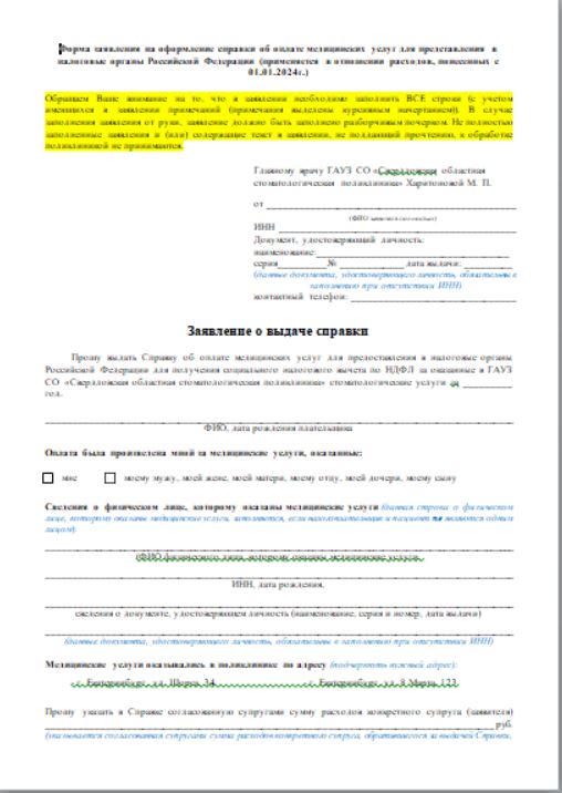 Справка для налогового вычетаСправку об оплате медицинских услуг для предоставления в налоговый орган (в отношении расходов, понесенных с 01 января 2024 г.) можно заказать, предоставив в поликлинику заявление о выдаче справки (по приложенной форме). Заполненное и подписанное заявление о выдаче справки об оплате медицинских услуг для предоставления в налоговый орган Вы можете предоставить: