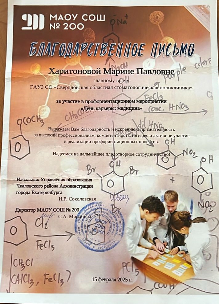 15 февраля в школе № 200 Чкаловского района города Екатеринбурга, которая является ресурсным центром Уральского государственного медицинского университета, прошла встреча представителей учреждений здравоохранения с учениками 10-11 классов и их родителями в рамках организованного Центром развития трудовых ресурсов «Дня карьеры: медицина». На мероприятии присутствовала главный врач Свердловской областной стоматологической поликлиники, главный внештатный специалист стоматолог Министерства здравоохранения Российской Федерации в Уральском федеральном округе, доктор медицинских наук, профессор Марина Павловна Харитонова. Она рассказала школьникам о профессии стоматолога, особенностях обучения на стоматологическом факультете, затронула моменты, связанные с условиями поступления в вуз. Ребятам было очень интересно познакомиться этой информацией, они задавали много вопросов по теме, участвовали в дискуссии, давали обратную связь. По результатам мероприятия главному врачу ГАУЗ СО «Свердловская областная стоматологическая поликлиника» было вручено благодарственное письмо. Стоит отметить, что подобные мероприятия в учебном заведении проводятся регулярно.