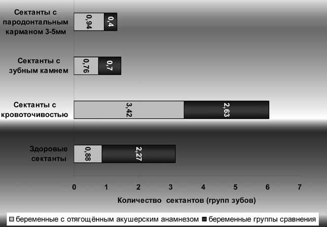 Введение За последнее десятилетие, по мнению акушеров–гинекологов, здоровье беременных женщин значительно ухудшилось. Резко сократилось число нормальных родов, удельный вес которых в некоторых субъектах Российской Федерации не достигает 25% [1]. Частота самопроизвольных прерываний беременности до 37 недели составляет, по материалам разных авторов, от 15 до 25% [2,3]. По данным экспертов ВОЗ, 15% всех зарегистрированных желанных беременностей заканчивается спонтанными абортами[3]. Если самопроизвольное прерывание беременности повторяется два-три раза подряд, то говорят о привычном невынашивании беременности [2]. Частота невынашивания беременности колеблется от 10 до 25% от общего числа беременностей, из них до 20% составляет синдром потери плода [3,4]. Как известно, количество беременностей, порядковый номер родов относятся к факторам, оказывающим непосредственное влияние на структуру стоматологических заболеваний в период беременности [5]. По данным эпидемиологического обследования А.В. Алимского 1993 года, по мере увеличения количества родов растут показатели распространённости основных стоматологических заболеваний (кариеса, гингивита, пародонтита) и их интенсивность [6]. Многими авторами доказана зависимость показателей стоматологической заболеваемости от характера течения беременности, количества предшествовавших беременностей, закончившихся родами [7,8,9]. В исследуемой нами литературе найдены единичные сообщения о снижении местного иммунитета и дисбиотических нарушениях в полости рта беременных женщин с привычным невынашиванием [10]. Поэтому мы считаем актуальным, исследовать стоматологический статус беременных женщин, анамнез которых отягощён акушерской патологией (выкидыши, неразвивающаяся беременность, привычное невынашивание). Целью нашего исследования является изучение и сравнение состояния полости рта у беременных женщин с физиологическим течением беременностей и с отягощённым акушерским анамнезом г.Екатеринбурга и Свердловской области. Материалы и методы Для проведения сравнительного анализа состояния полости рта нами было обследовано 2 группы беременных женщин г.Екатеринбурга и Свердловской области II триместра (13-28 недель) беременности в возрастном интервале от 20-30 лет. В первую группу обследования (основную) входили 60 беременных женщин с отягощённым акушерским анамнезом. Вторую группу (сравнения) составляли 45 женщин с неосложнённым акушерским анамнезом. Критерии включения беременных в группу с отягощённым акушерским анамнезом были следующие: наличие в анамнезе повторных выкидышей, неразвивающихся беременностей, привычное невынашивание, перинатальная гибель плода. Группу сравнения составляли первобеременные или повторнобеременные, повторнородящие женщины. Стоматологическое обследование состояния полости рта женщин обеих групп проходило на базе НИИ ОММ 2-го акушерского отделения патологии беременных и на базе женской консультации МУ ЦГБ №20 г.Екатеринбурга. Для исследования стоматологического статуса беременных женщин использовали стандартный набор стоматологических инструментов (зонд угловой, пуговчатый и зеркало). Осмотр полости рта проводили обязательно при наличии искусственного освещения. Стоматологическое обследование включало: анализ жалоб, анамнестические данные акушерско