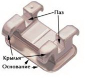 Брекет состоит из основания, паза и крыльев.Основанием брекет с помощью специального материала фиксируется на коронке зуба и задает ему направление движения для правильной установки в зубном ряду.Для каждого зуба брекет сугубо индивидуален.В паз брекета вставляется ортодонтическая дуга.