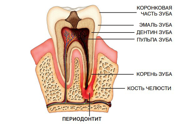 Это воспаление тканей, окружающих зуб, которое возникает при проникновении микроорганизмов и их токсинов из кариозной полости через пульпу в окружающую костную ткань.