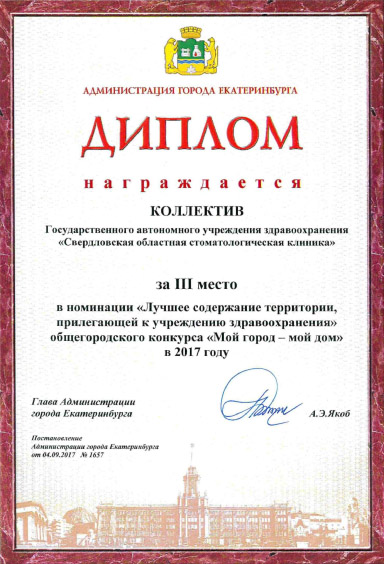Коллектив поликлиники был награжден Администрацией Екатеринбурга за содержание прилегающей территории26 сентября 2017 - вторник 4 сентября 2017 года Администрация города Екатеринбурга в рамках общегородского конкурса "Мой город - мой дом" наградила коллектив поликлиники дипломом за III место в номинации "Лучшее содержание территории, прилегающей к учреждению".