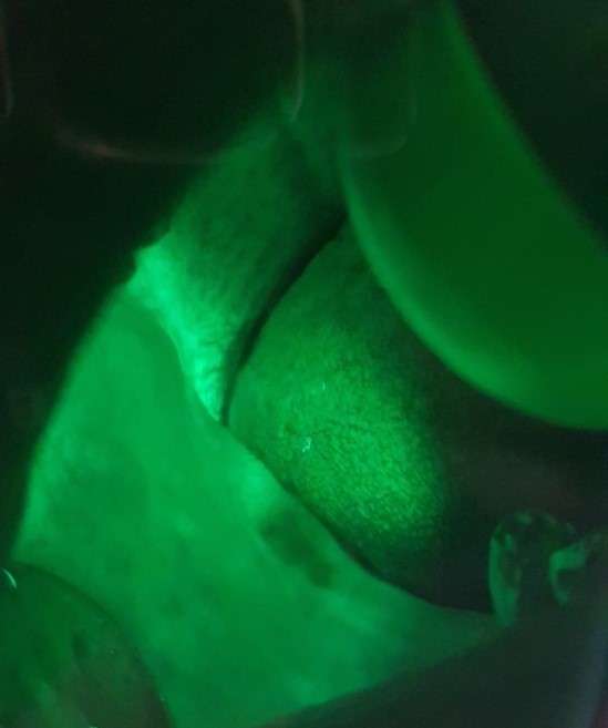 Фото 7 Метод АФС – это метод оптической визуализации патологических изменений слизистой оболочки, при котором выявление злокачественного перерождения происходит за счет уменьшения интенсивности ее аутофлуоресцентного (эндогенного свечения). Данный метод имеет ряд достоинств: время осмотра занимает 2-3 минуты, неинвазивен, имеет высокую чувствительность ко всем заболеваниям слизистой оболочки полости рта. Как работает данная технология? При освещении лампой АФС слизистой оболочки возникает эндогенное свечение, которое можно наблюдать через специальные очки. Здоровая слизистая оболочка полости рта имеет зеленое свечение различной интенсивности, а очаги раннего предрака и рака имеют аномальное свечение в виде затемнения (эффект «темного пятна») (фото 8,9,10,11) Раннее выявление злокачественного процесса может спасти Вашу жизнь!