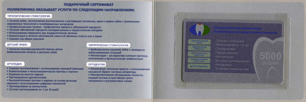 на весь комплекс стоматологических услуг на сумму 1000, 2000, 5000 или 10000 рублей.