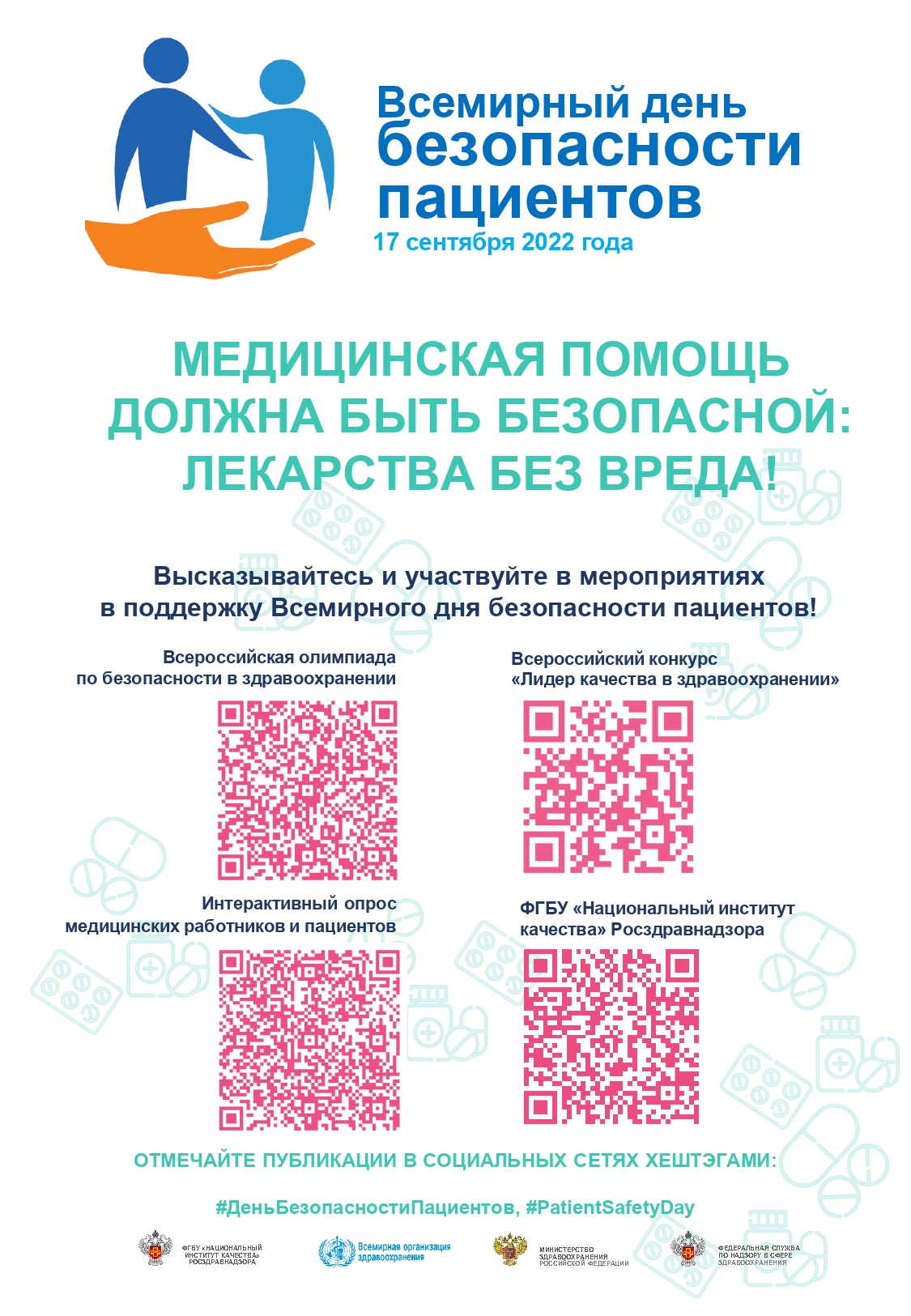 17 сентября 2022 г. Министерством здравоохранения России совместно с Федеральной службой по надзору в сфере здравоохранения в России запланированы мероприятия, посвященные Всемирному дню безопасности пациентов в 2022 году.