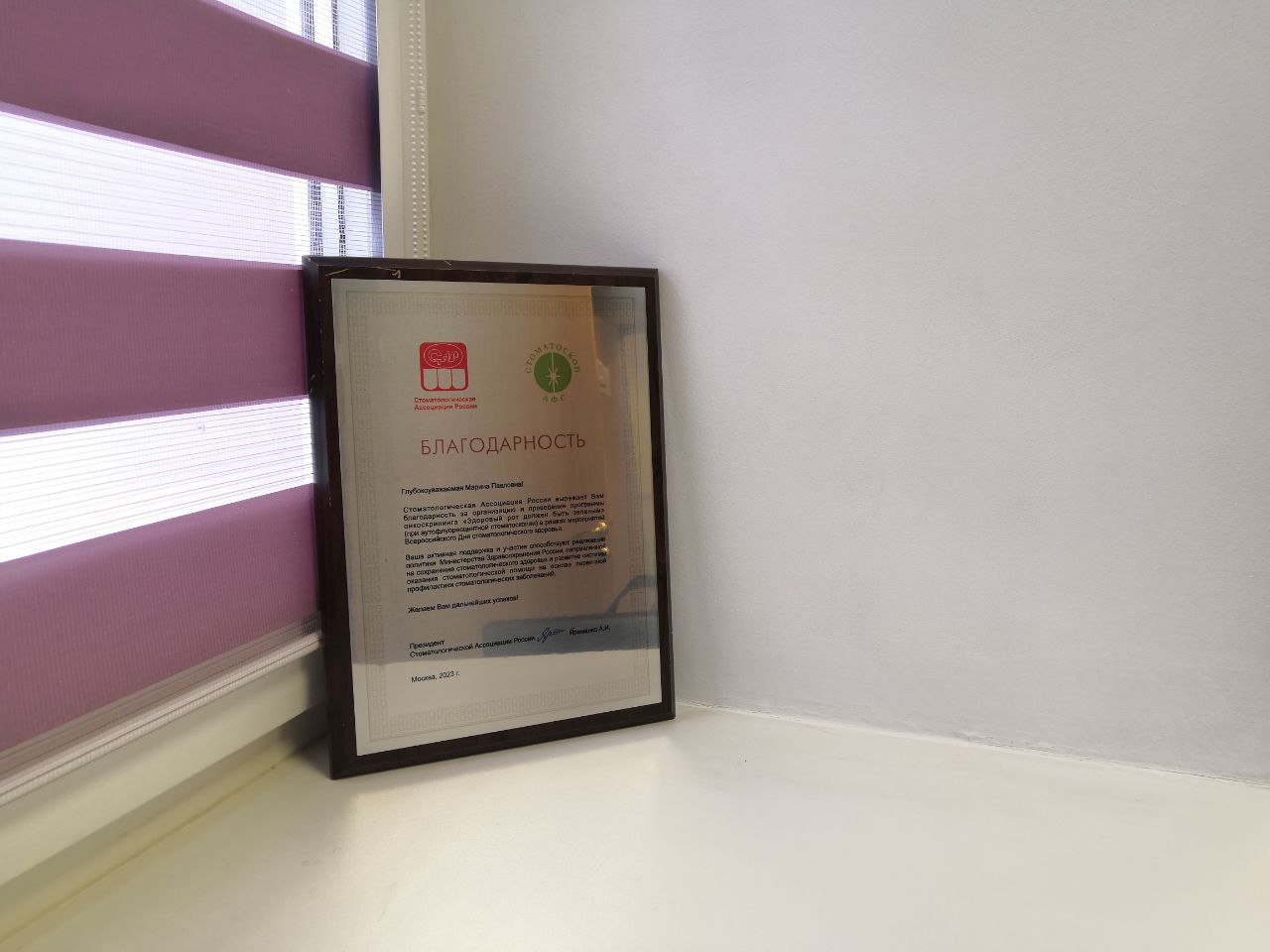 В благодарности от Стоматологической ассоциации отмечен вклад поликлиники в лице главного врача Марины Павловны Харитоновой в реализацию политики Министерства здравоохранения России, направленной на сохранение стоматологического здоровья и развитие системы оказания стоматологической помощи на основе первичной профилактики стоматологических заболеваний.