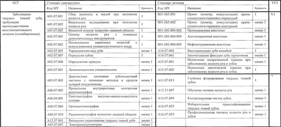 2. Усредненная кратность манипуляции, применяемых при лечении заболеваний, входящих в состав КСГ, применяемые материалы. Эта таблица составлялась для вычисления среднего показателя затратоем кости КСГ, выраженной в УЕТ и в денежном эквиваленте (табл. 5). Таблица 5. Проводимые манипуляции и используемые материалы при оказании стоматологической помощи на терапевтическом приеме***